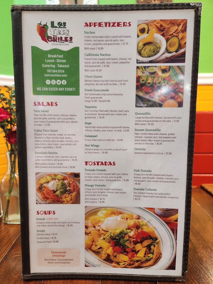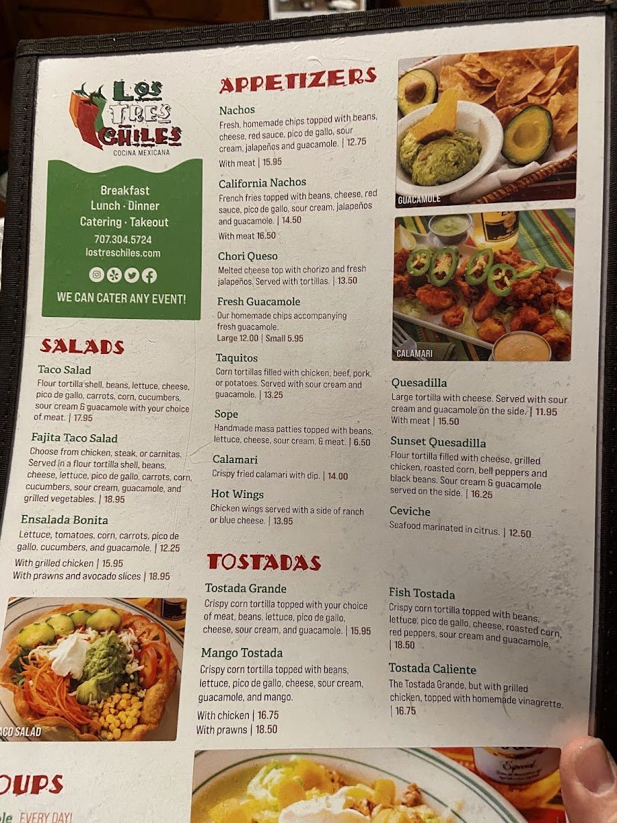 Introducing the menu at Los Tres Chiles, a vibrant Mexican restaurant nestled in Santa Rosa, CA, offers a rich tapestry of authentic flavors crafted with passion and tradition. Their lunch specials impress with perfectly sautéed fish tacos, paired with fresh pico de gallo, garlic butter, and chipotle sauce, served alongside hearty rice and beans. Breakfast lovers will delight in comforting classics like pozole stew, menudo, and chilaquiles, each packed with robust spices and hominy or tender tripe, creating a true taste of Mexico’s heart.